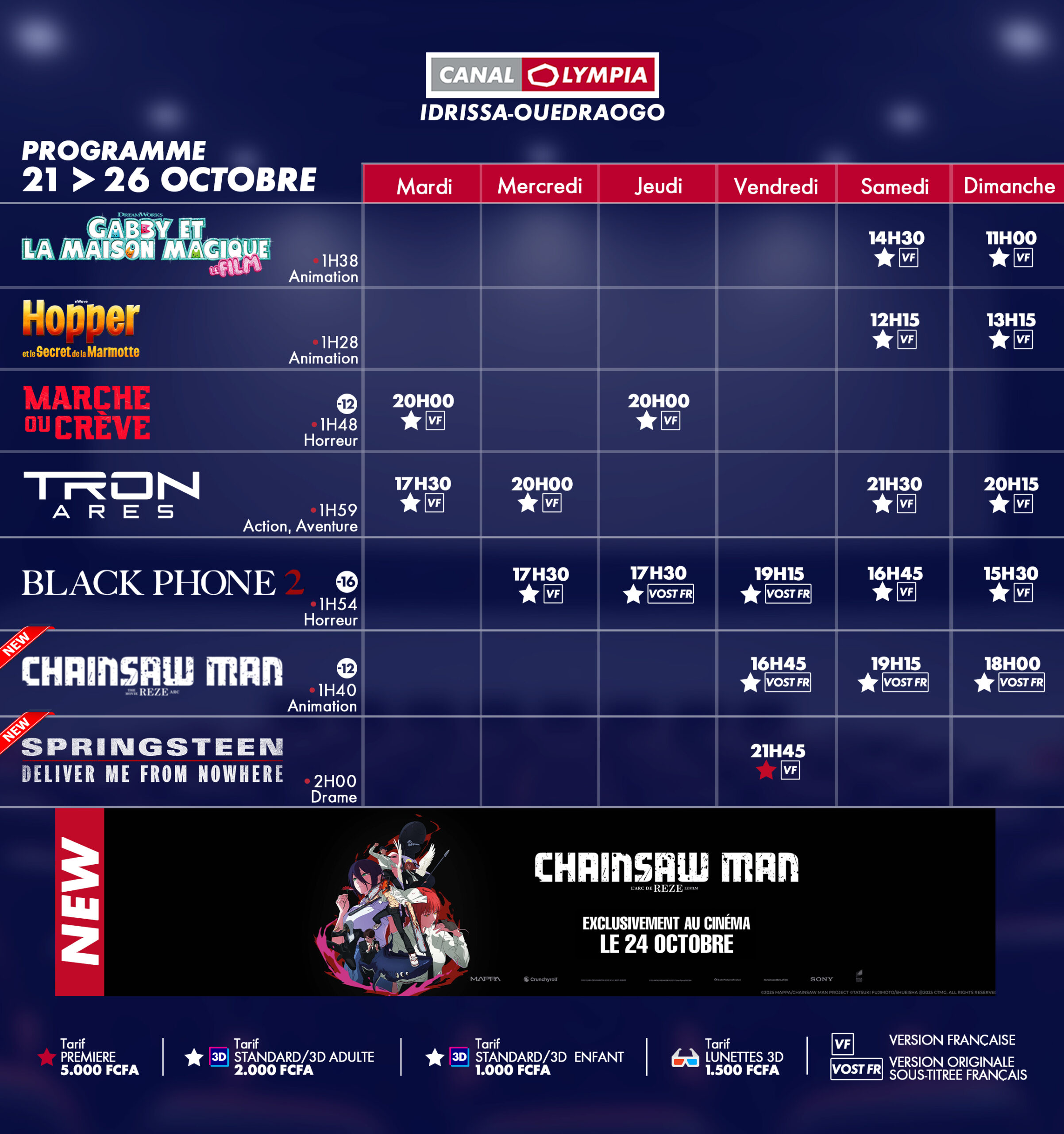 Subscribe to the program of the CanalOlympia Idrissa Ouédraogo hall to receive each week the program of your cinema hall directly in your mailbox!