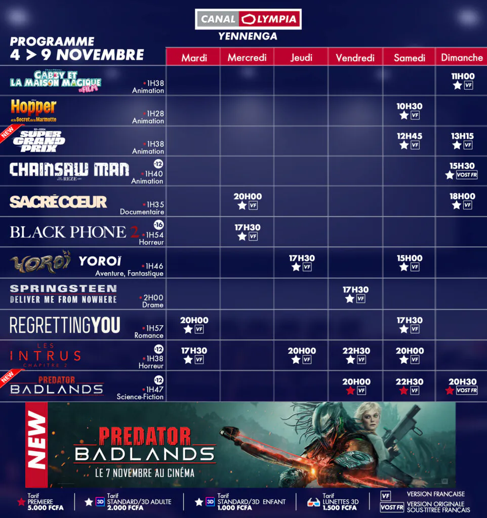 Subscribe to the program of the CanalOlympia Yennenga hall to receive each week the program of your cinema hall directly in your mailbox!